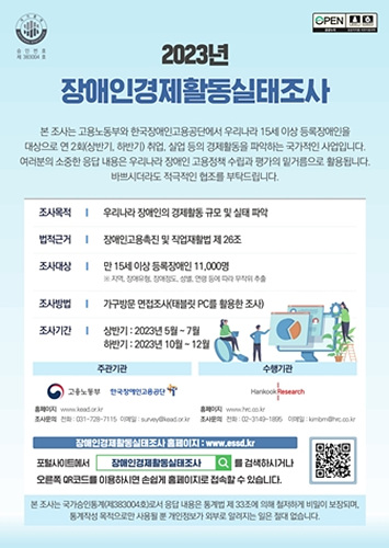 한국장애인고용공단 고용개발원(원장 조윤경)이 23일 장애인 고용정책 수립에 필요한 노동시장 기초 통계자료를 확보하기 위한 ‘2023년 하반기 장애인경제활동실태조사’에 들어갔다.