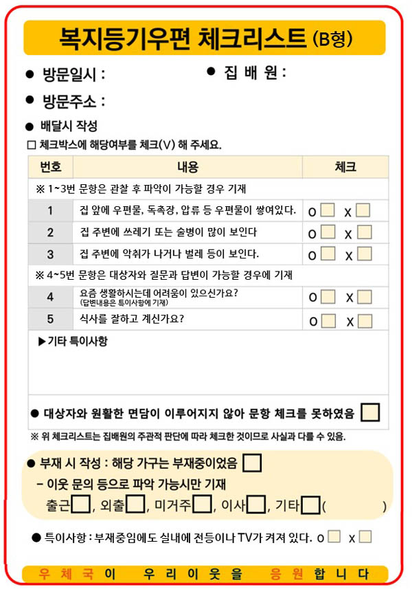 우체국과 지방자치단체가 함께 운영하는 복지등기우편의 ‘체크리스트’다. 집배원이 직접 위기 의심가구의 안부 등을 체크해 지자체에 전달한다. 집배원이 체크리스트를 작성해 회송 봉투에 담아 보내면 지자체는 내용을 검토한 뒤 관할 행정복지센터를 통해 위기가구 지원에 나서는 방식이다.