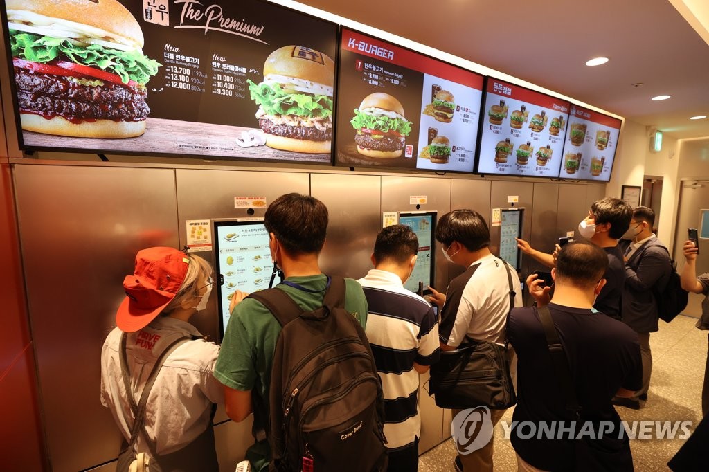시각장애인들이 지난 7월 12일 서울의 한 패스트푸드점을 찾아 무인주문기(키오스크)에서 실제 주문을 해보는 '내돈내산 권리찾기 캠페인'을 하고 있다. [연합뉴스 자료사진]