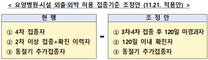 오늘(21일)부터 요양병원 입원환자가 외출, 외박을 하기 위해서는 오미크론 변이 대응 2가 개량백신을 접종했거나 확진된 지 120일 이내여야 하는 등 기준이 강화된다. 또 앞으로 감염취약시설 등의 추가접종률을 제고하기 위해 4주간 집중 접종기간으로 운영된다.