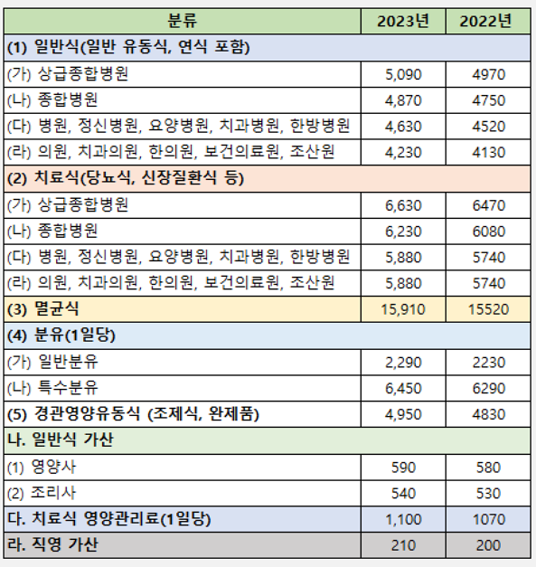 2023년도 의료기관 식대 수가가 2.4% 인상되고, 일반식 가산, 직영 가산도 소폭 오른다.