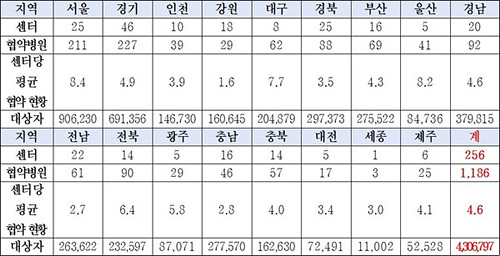 지역별 치매안심센터(이하 센터) 및 협약병원 현황. ⓒ최혜영 의원실
